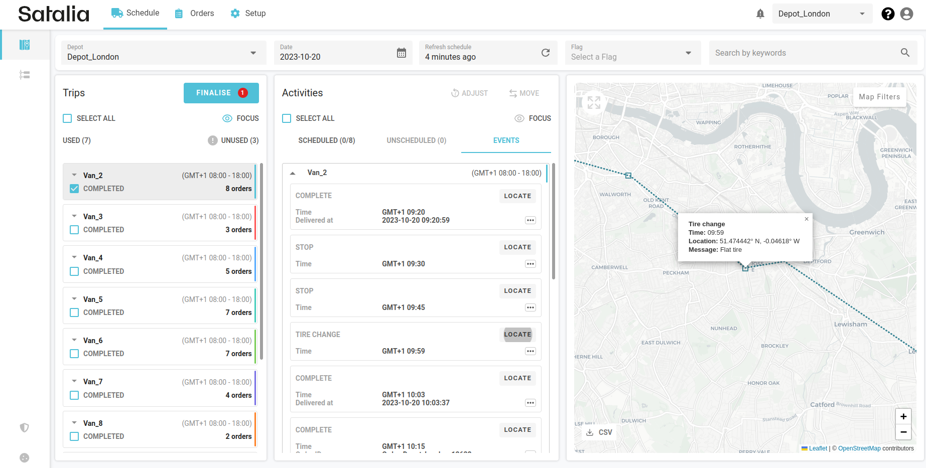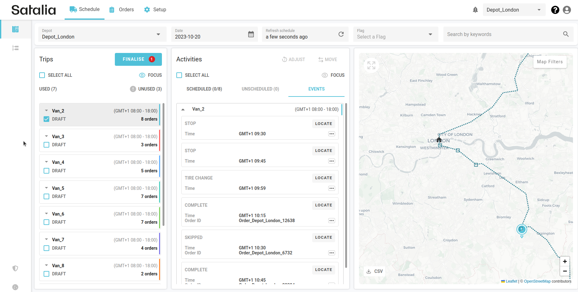 The van symbol on the map indicates where the driver is at that current moment or where their last location ping was within the trip.
