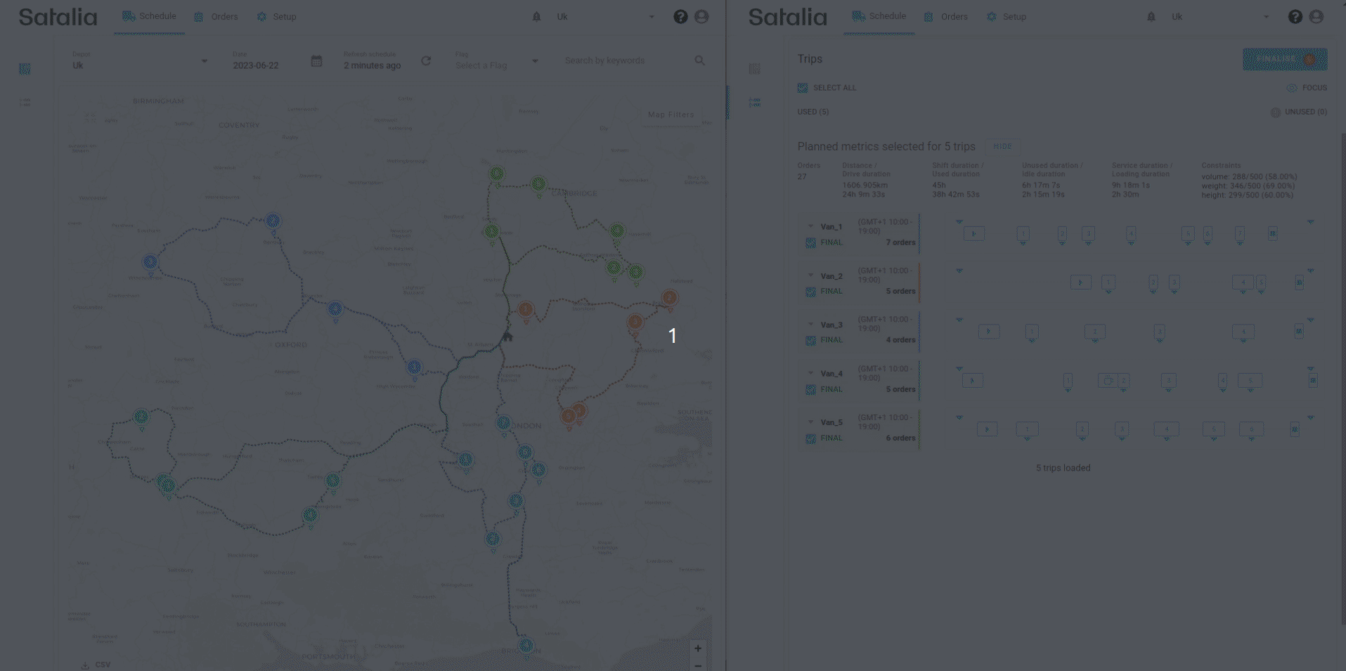 Pings should be automatically sent from the vehicle at regular intervals and are displayed on the schedule map as an actual route. To activate pings functionality, you need to integrate our Locations API with your trip execution solutions, usually telematics or driver application.