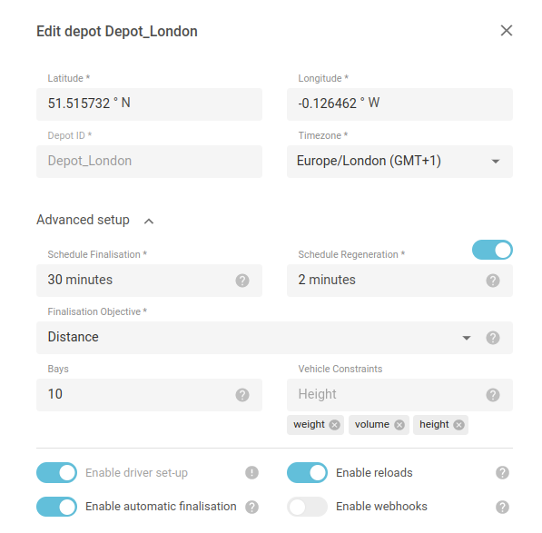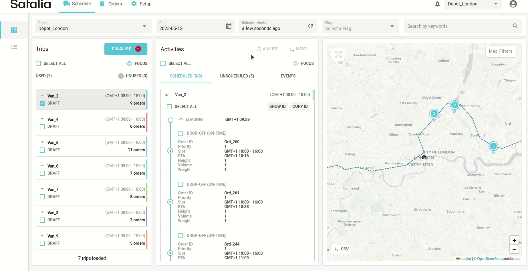 Finalise trip is an action when a trip from draft becomes final. Once it becomes final no changes can be made to the trip and it will no longer be affected by optimisation. This is important when preparing your trips for picking & packing and the loading stage, when no changes to the trips can happen.