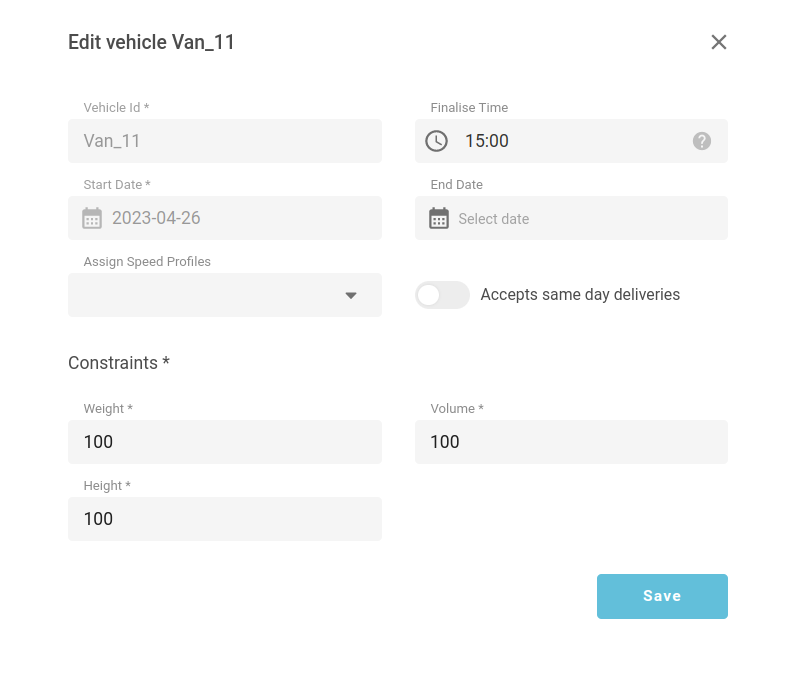 For example, below at 15:00, the status of a trip for this vehicle will be set to ‘Final’. 30 minutes before the 15:00 time status, trips for this vehicle will be set to ‘Prefinal’.