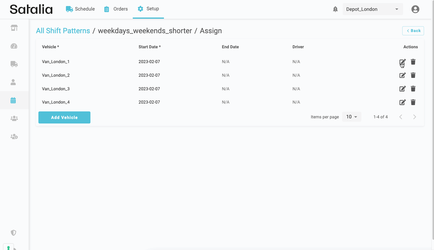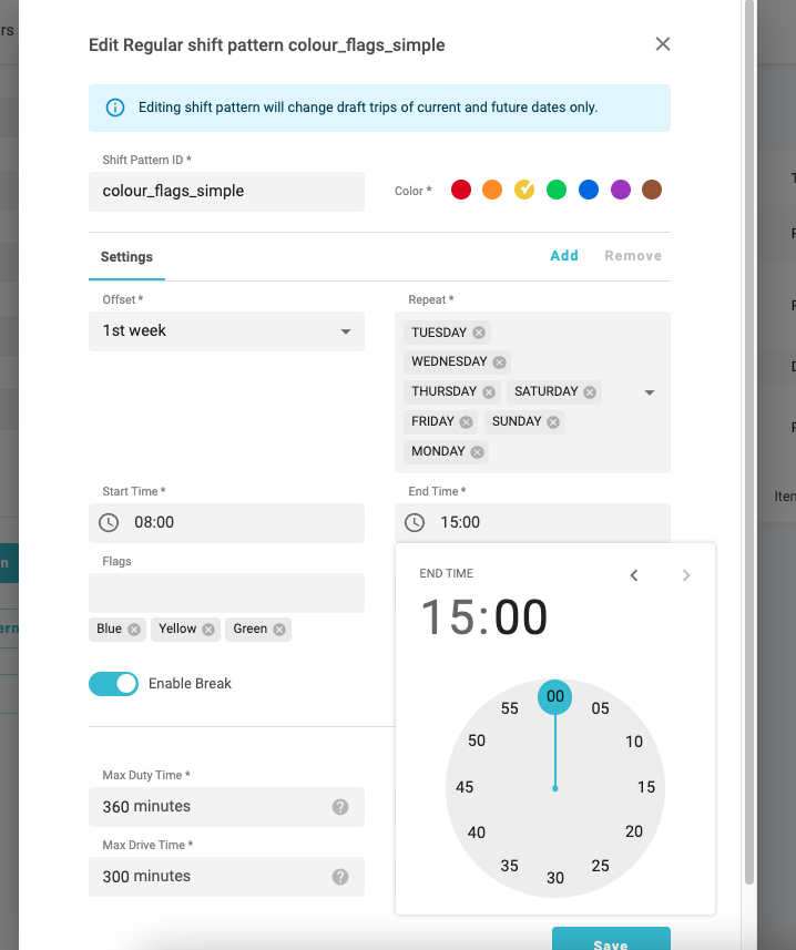 Editing the shift pattern is allowed at any time, changes will impact ALL vehicles assigned to the pattern. It will be applied only to draft trips of the current and future dates.