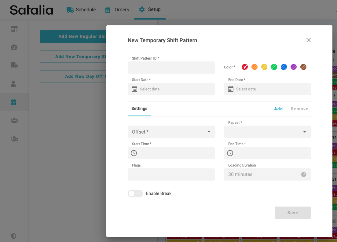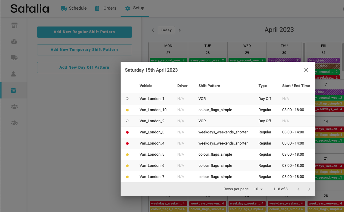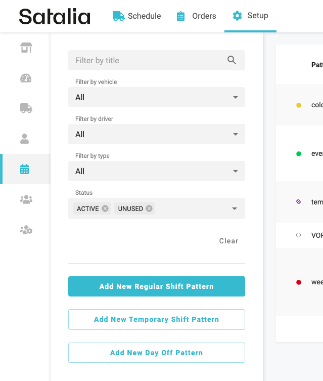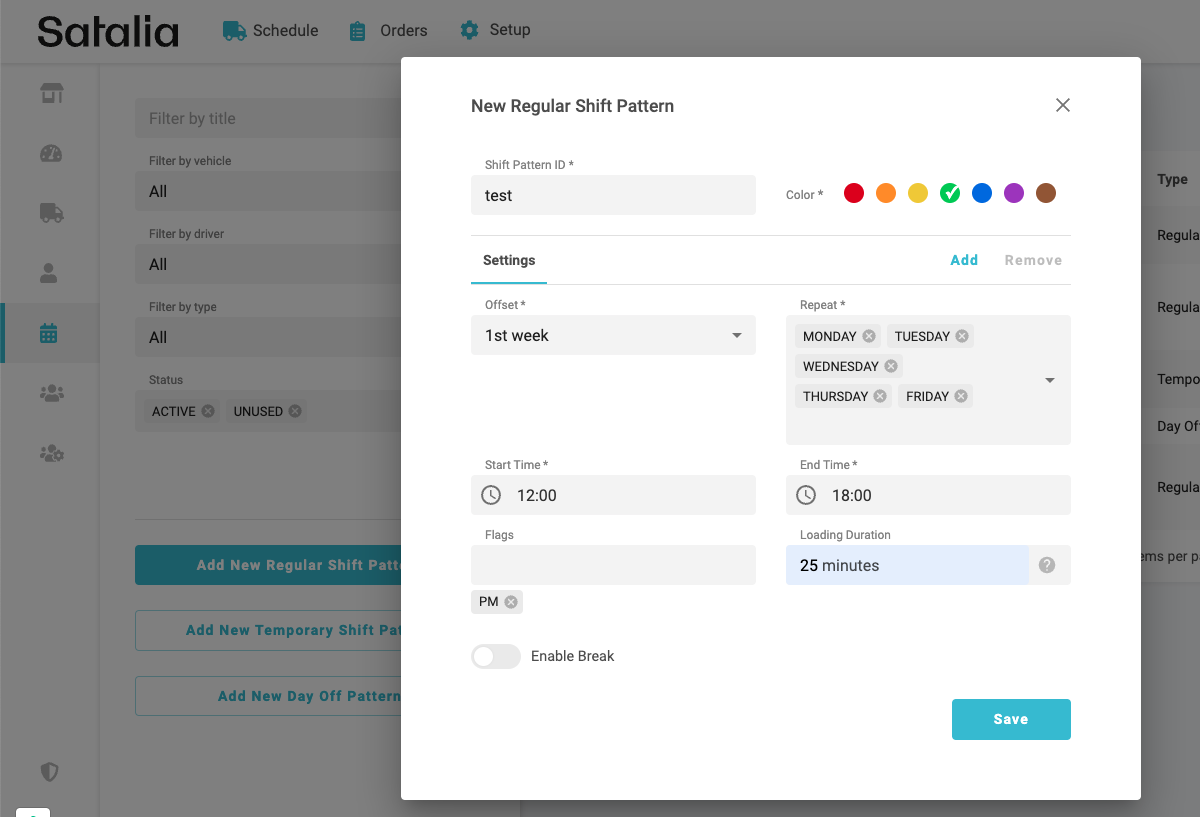 Shift patterns allow easier grouping and management of resources with the same shift settings: first, create a repeatable shift pattern, second, assign as many vehicles to the pattern as needed.