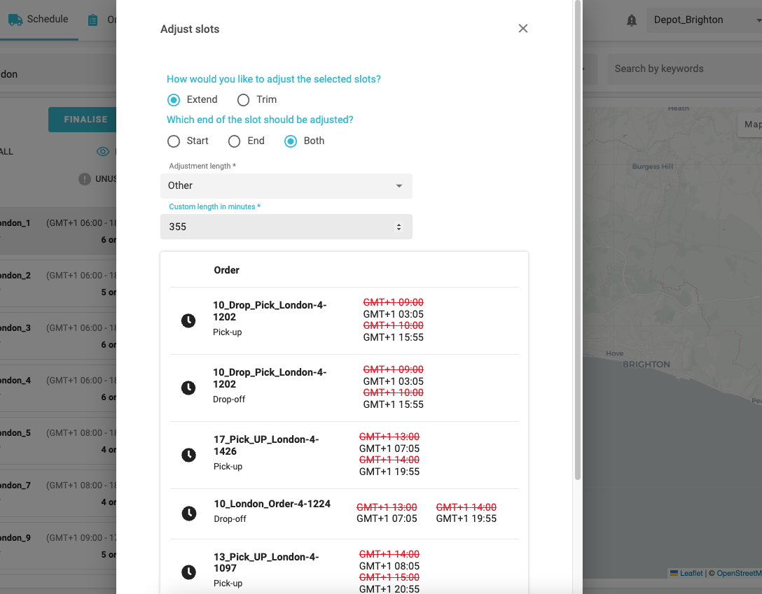 Adjust orders' time slots for multiple trips in one go and trim/ extend slots by any duration.