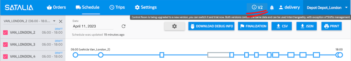 When logging in to Satalia Delivery by default users will access Control Room v1. Type /v2 at the end of the standard URL to access Control Room v2, i.e. <...>.delivery.satalia.io/v2 or access it by clicking on the link on v1.