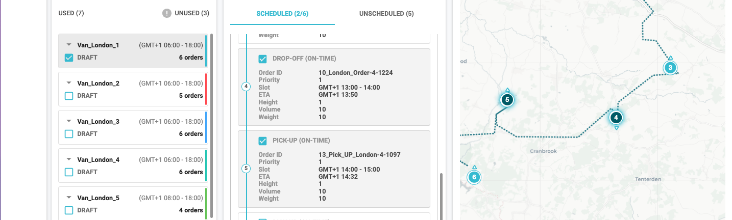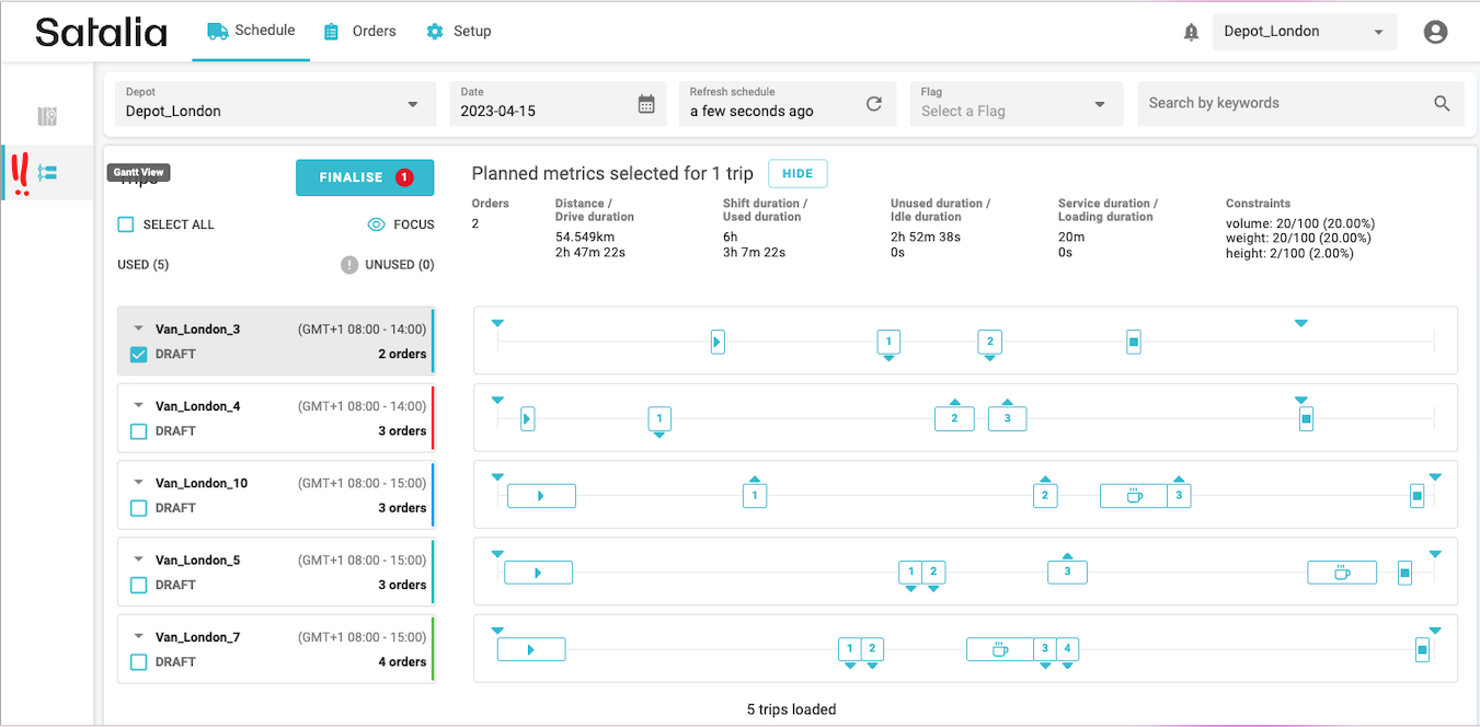 The Gantt view has numerous changes: numbered sequence for stops; distinct icons for breaks, reloads and reloads as breaks; richer tooltip with order information; arrows pointing up and down respectively indicating if it’s a pick-up or a drop-off.