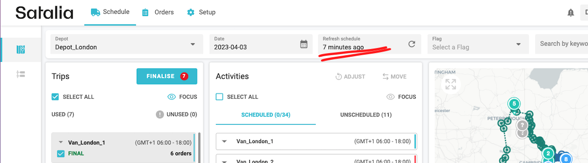 Auto-refresh of the Schedules page was turned off for better usability. Now the information on the top filter bar indicates when it was the last time the view of the schedule was updated and the user has the full control on when to update it. Note: the schedule is being constantly recalculated and updated in the background, it is just not updating in the website to create fewer interruptions for the user.