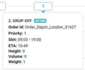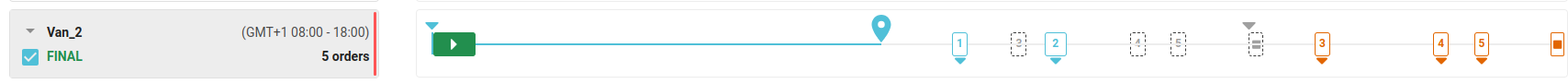 If, for instance, a vehicle is significantly delayed due to a traffic jam, orders will be shifted to the new ETA slots. The borders around the box will then switch to orange to indicate predicted lateness. Additionally, a grey icon appears near their original delivery time. This helps you to gauge the extent of the delay and estimate the extra time until the orders are delivered.