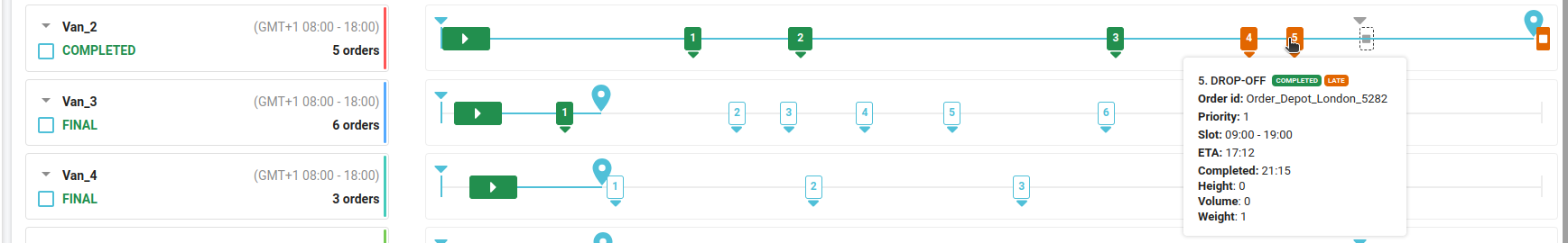 In the new example below, it shows that the last two orders were delivered outside their scheduled time slots. This is why they are marked in orange. For example, order number five had a time slot at 09:00 - 19:00, but instead it was completed at 21:15.