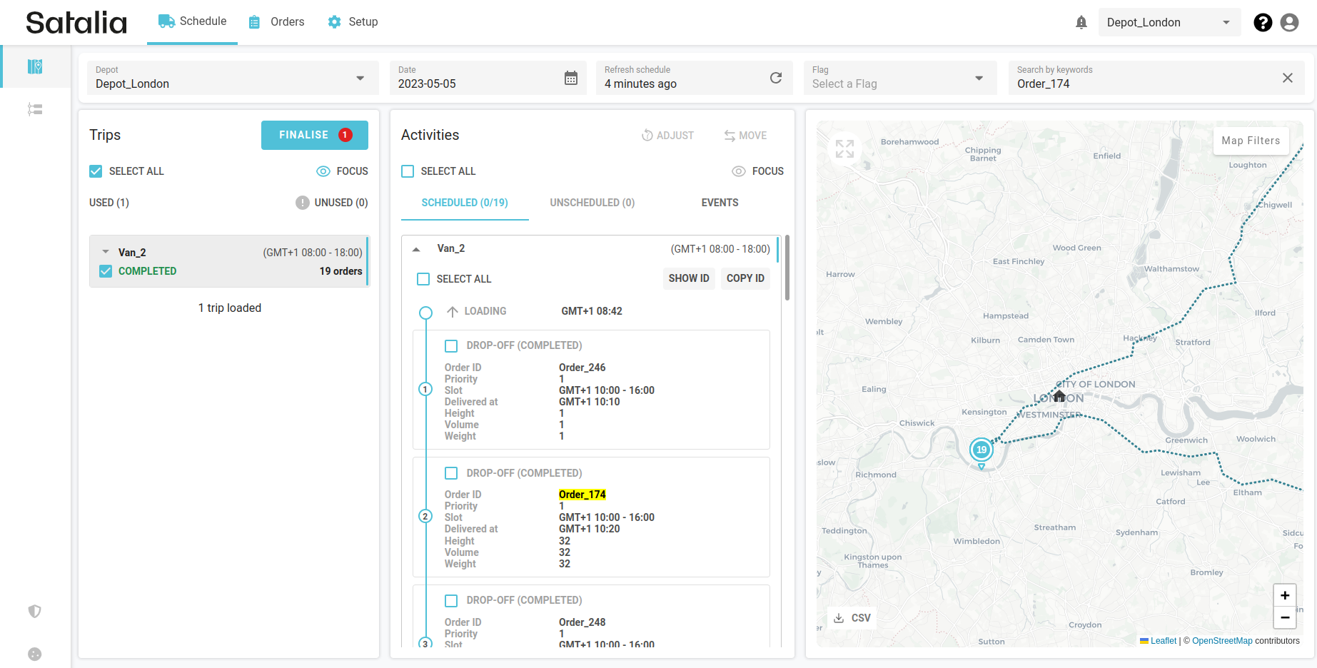 Review future schedules and finalise trips. Also, you can manage unscheduled orders by adjusting various order parameters or moving them to another depot.